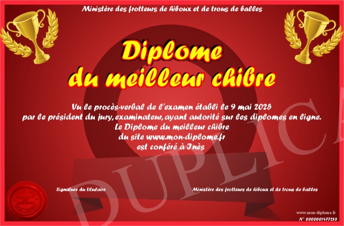 Envoyez par email votre Diplôme du meilleur chibre personalisé