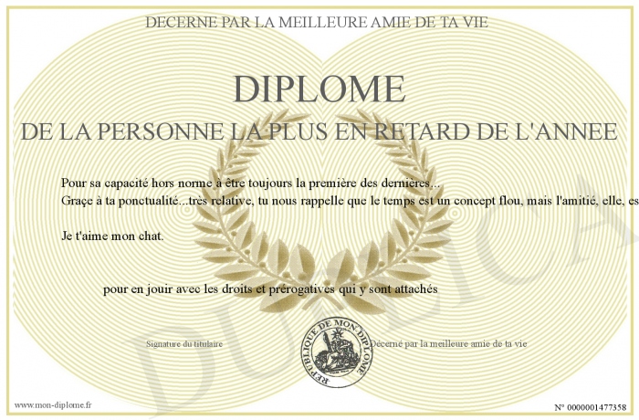 Envoyez par email votre Diplôme de la personne la plus en retard de l'année personalisé