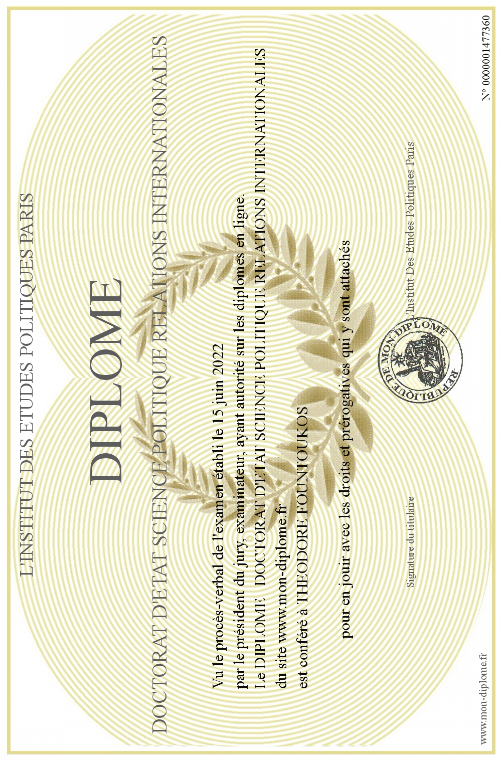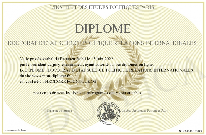 Envoyez par email votre DIPLOME DOCTORAT D'ETAT SCIENCE POLITIQUE RELATIONS INTERNATIONALES personalisé