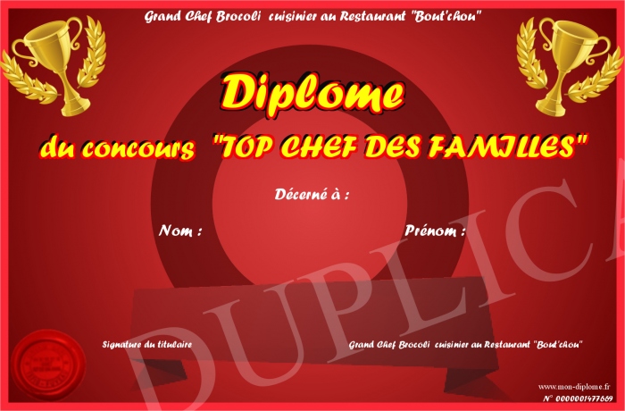 Envoyez par email votre Diplôme du concours -TOP CHEF DES FAMILLES- personalisé