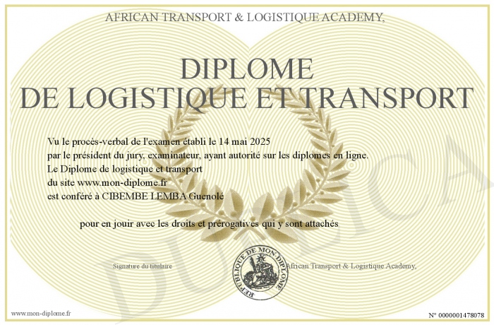 Envoyez par email votre Diplôme de logistique et transport personalisé