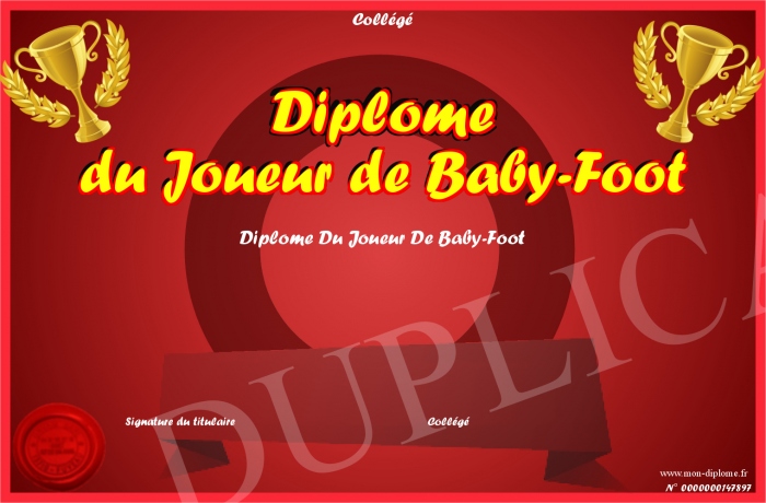 Envoyez par email votre Diplome du Joueur de Baby-Foot personalisé