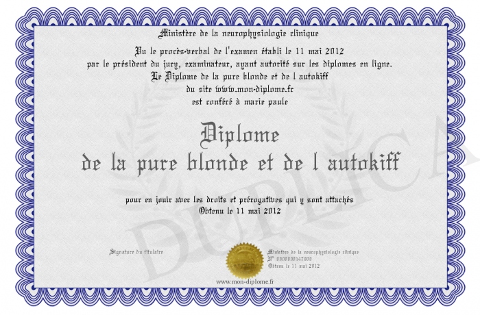 Envoyez par email votre Diplôme de la pure blonde et de l autokiff personalisé