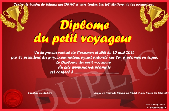 Envoyez par email votre Diplôme du petit voyageur personalisé