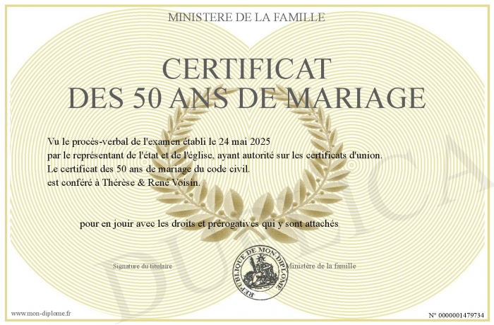 Envoyez par email votre Certificat des 50 ans de mariage personalisé