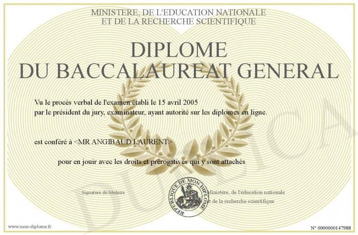 Envoyez par email votre Diplôme du baccalaureat général personalisé