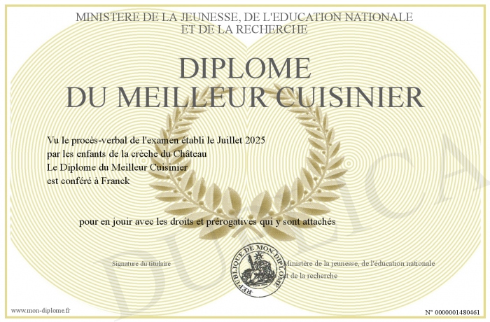 Envoyez par email votre Diplôme du Meilleur Cuisinier personalisé