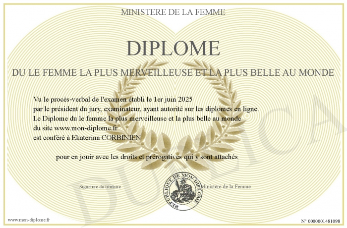 Envoyez par email votre Diplôme du le femme la plus merveilleuse et la plus belle au monde personalisé