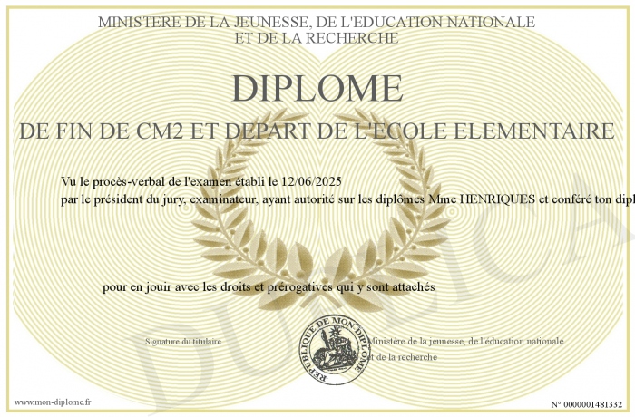 Envoyez par email votre Diplôme de fin de CM2 et départ de l'école élémentaire personalisé