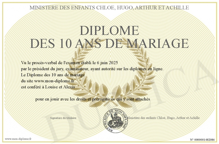 Envoyez par email votre Diplôme des 10 ans de mariage personalisé