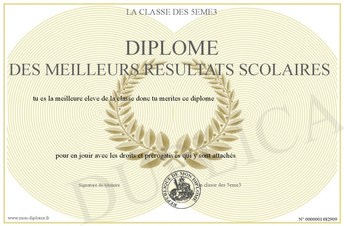 Envoyez par email votre Diplôme des meilleurs resultats scolaires personalisé