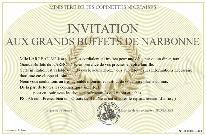 Envoyez par email votre Invitation aux Grands Buffets de NARBONNE personalisé