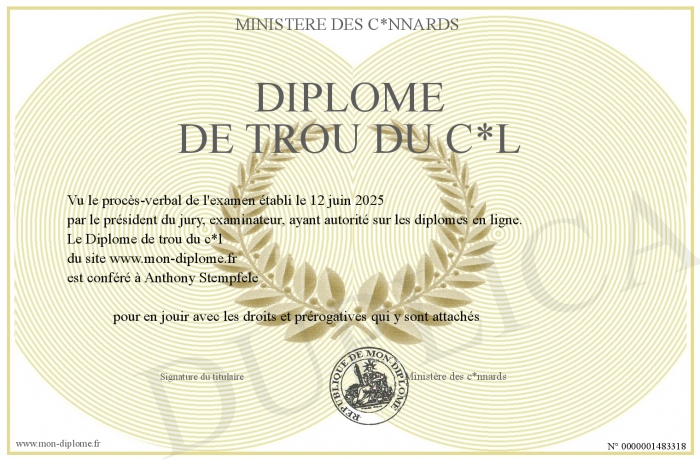 Envoyez par email votre Diplôme de trou du c*l personalisé
