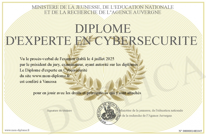 Envoyez par email votre Diplôme d'experte en Cybersécurité personalisé
