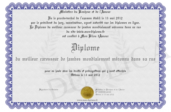 Envoyez par email votre Diplôme du meilleur caresseur de jambes mondialement méconnu dans sa rue personalisé