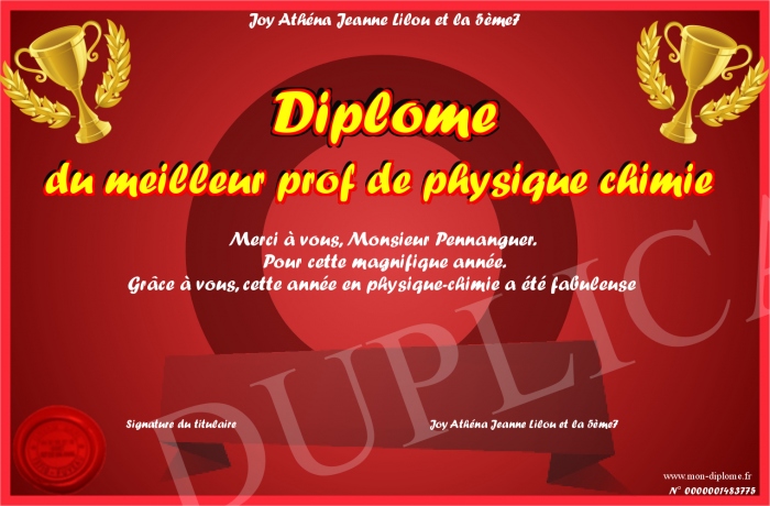 Envoyez par email votre Diplôme du meilleur prof de physique chimie personalisé