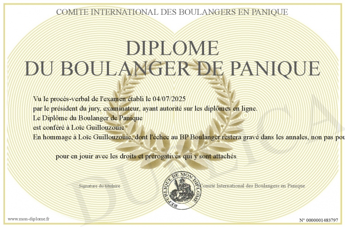 Envoyez par email votre Diplôme du Boulanger de Panique personalisé