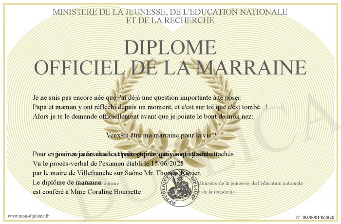 Envoyez par email votre Diplôme officiel de la marraine personalisé