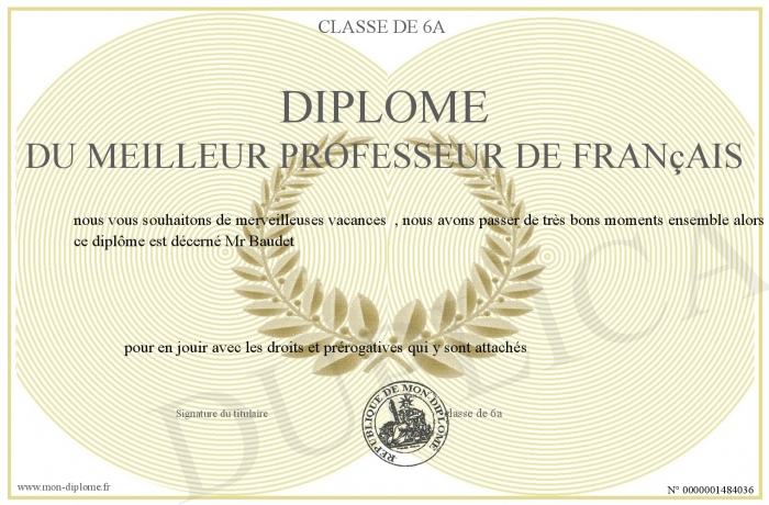 Envoyez par email votre Diplôme du meilleur professeur de français personalisé