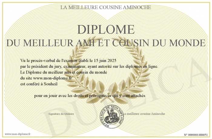 Envoyez par email votre Diplôme du meilleur ami et cousin du monde personalisé