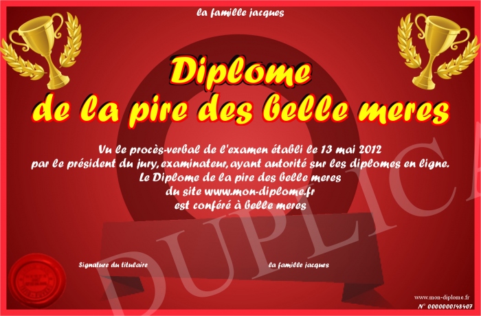 Envoyez par email votre Diplôme de la pire des belle meres personalisé