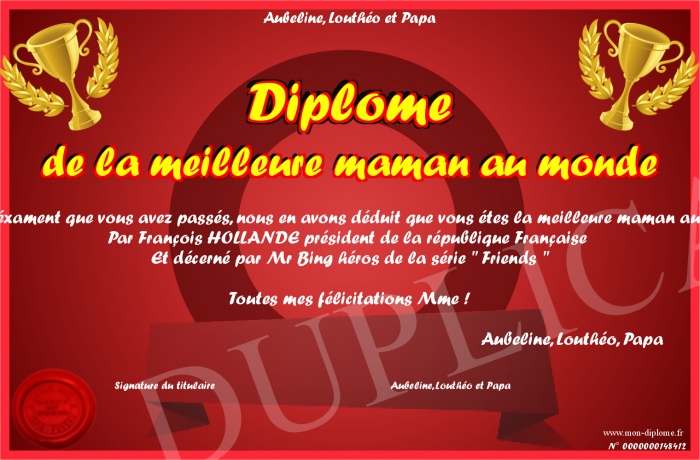 Envoyez par email votre Diplôme de la meilleure maman au monde personalisé