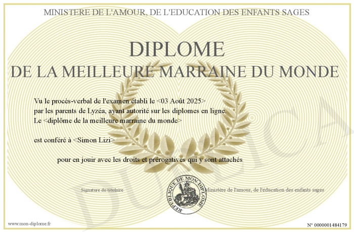 Envoyez par email votre Diplôme de la meilleure Marraine du monde personalisé
