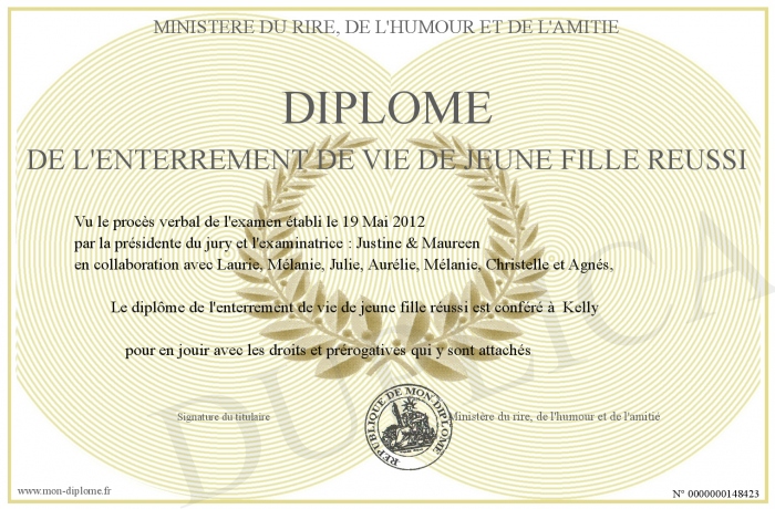 Envoyez par email votre Diplôme de l'enterrement de vie de jeune fille réussi personalisé