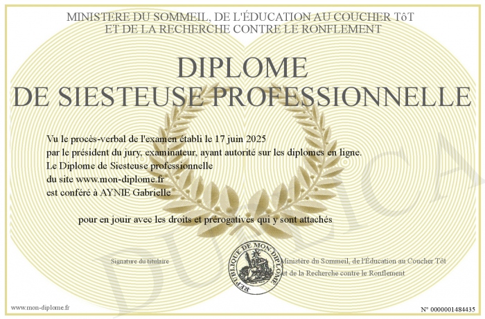 Envoyez par email votre Diplôme de Siesteuse professionnelle personalisé
