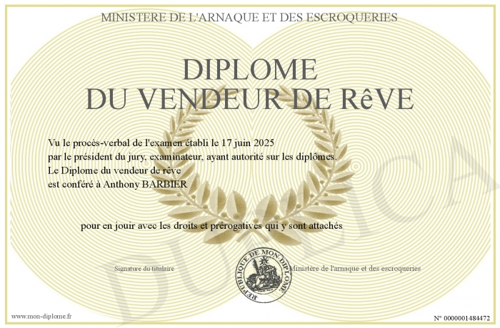 Envoyez par email votre Diplôme du vendeur de rêve personalisé