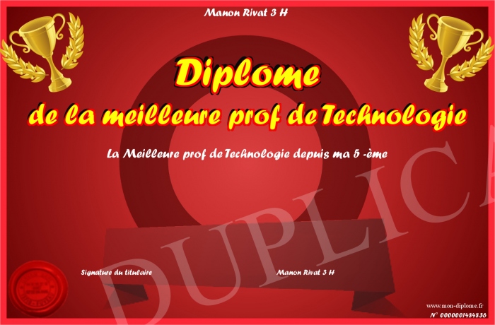 Envoyez par email votre Diplôme de la meilleure prof de Technologie personalisé