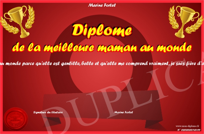 Envoyez par email votre Diplome de la meilleure maman au monde personalisé