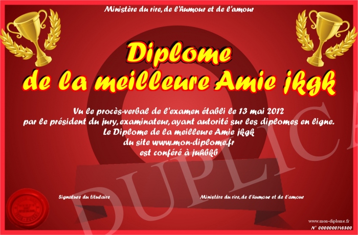 Envoyez par email votre Diplome de la meilleure Amie jkgk personalisé