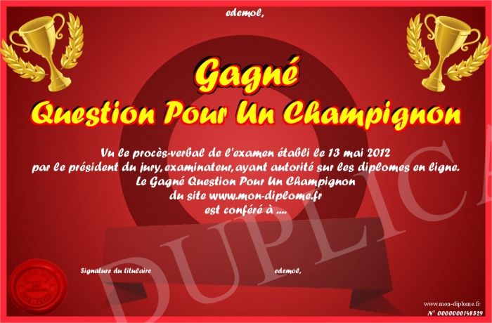 Envoyez par email votre Gagné Question Pour Un Champignon personalisé