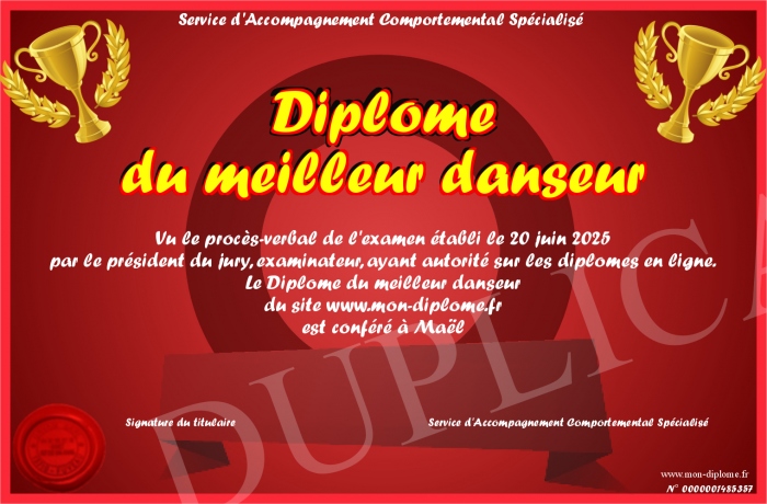 Envoyez par email votre Diplôme du meilleur danseur personalisé