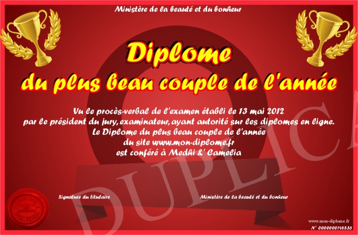 Envoyez par email votre Diplôme du plus beau couple de l'année personalisé