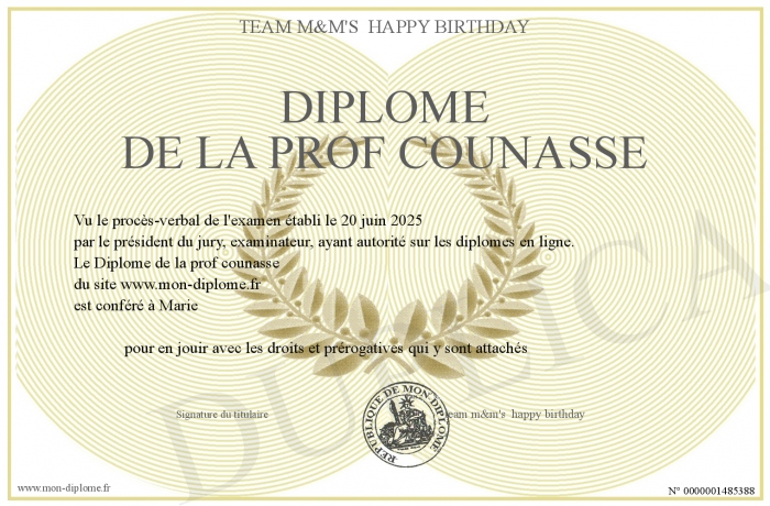 Envoyez par email votre Diplôme de la prof counasse personalisé