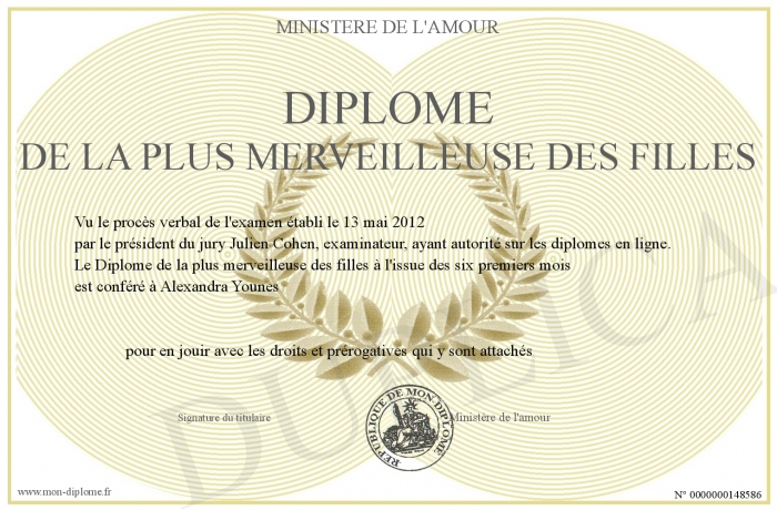 Envoyez par email votre Diplôme de la plus merveilleuse des filles personalisé