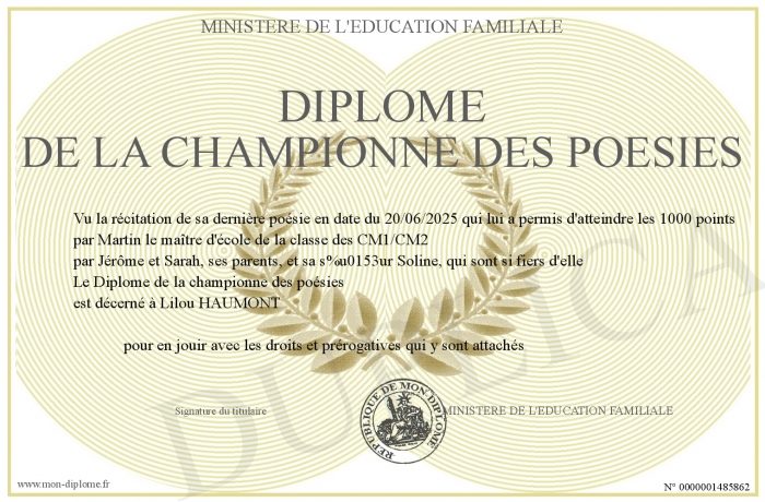 Envoyez par email votre Diplôme de la championne des poésies personalisé