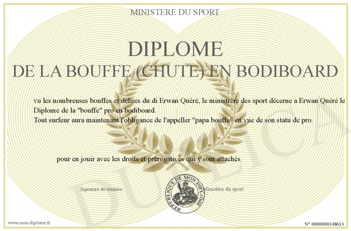 Envoyez par email votre Diplôme de la bouffe (chute) en bodiboard personalisé