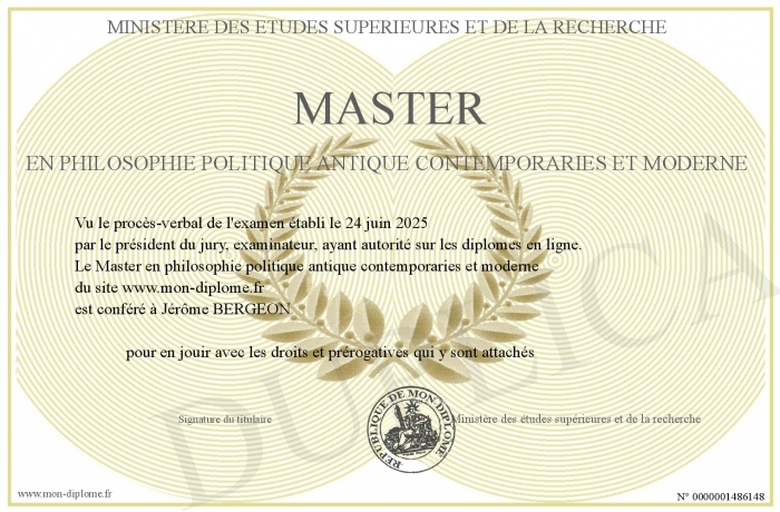 Envoyez par email votre Master en philosophie politique antique contemporaries et moderne personalisé