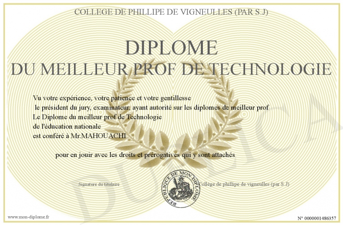 Envoyez par email votre Diplôme du meilleur prof de Technologie personalisé