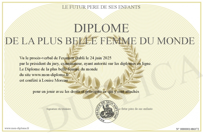 Envoyez par email votre Diplôme de la plus belle femme du monde personalisé