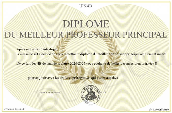Envoyez par email votre Diplôme du meilleur professeur principal personalisé