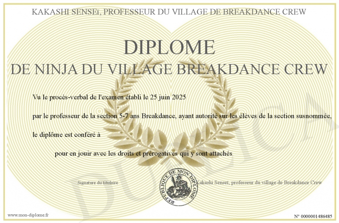 Envoyez par email votre Diplôme de Ninja du village Breakdance Crew personalisé
