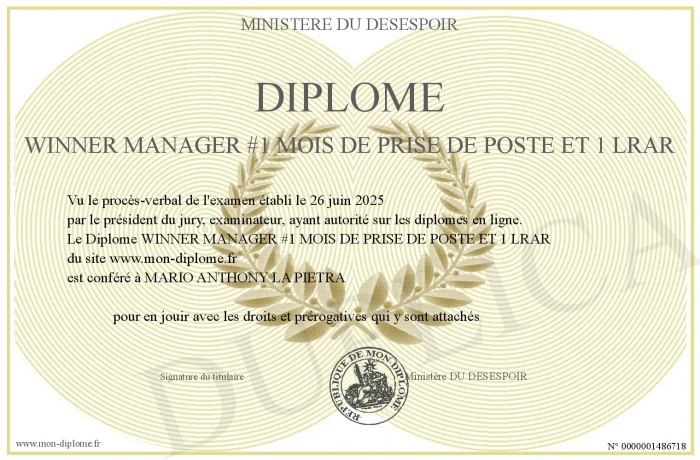 Envoyez par email votre Diplôme WINNER MANAGER #1 MOIS DE PRISE DE POSTE ET 1 LRAR personalisé
