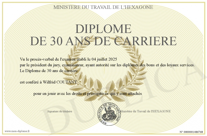 Envoyez par email votre Diplôme de 30 ans de carrière personalisé