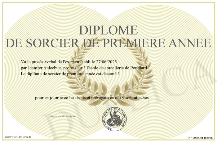 Envoyez par email votre Diplôme de sorcier de première année personalisé
