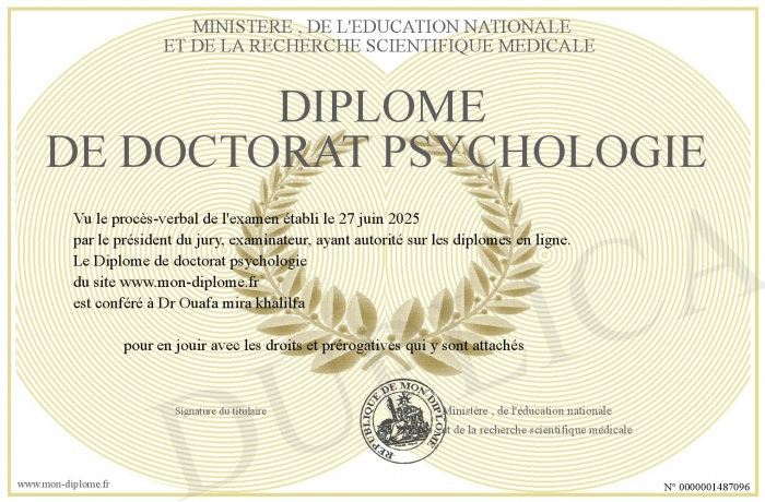 Envoyez par email votre Diplôme de doctorat psychologie personalisé