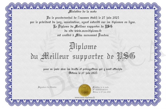 Envoyez par email votre Diplôme du Meilleur supporter de PSG personalisé